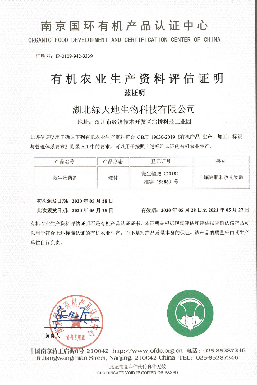 公司微生物菌劑獲得有機農業生產資料評估證明
