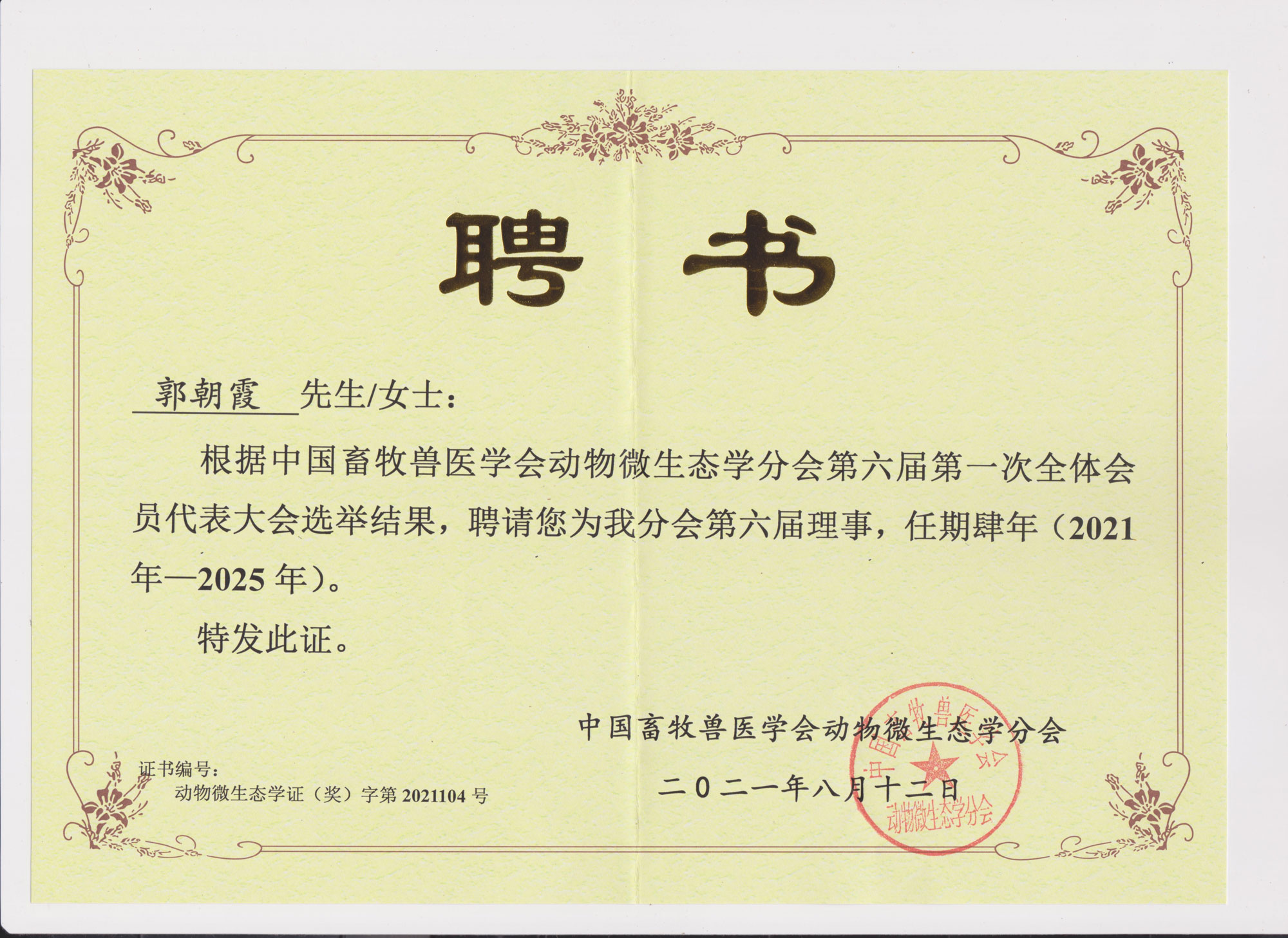 總經理郭朝霞女士被聘為中國畜牧獸醫學會動物微生態學分會第六屆理事