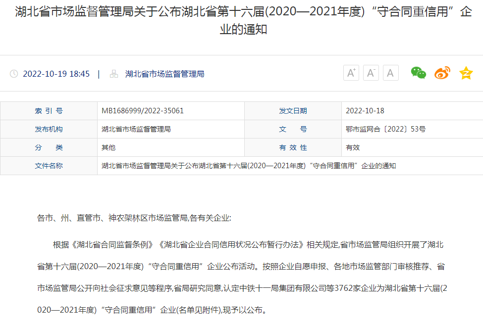 公司獲湖北省第十六屆(2020—2021年度)“守合同重信用”企業榮譽稱號